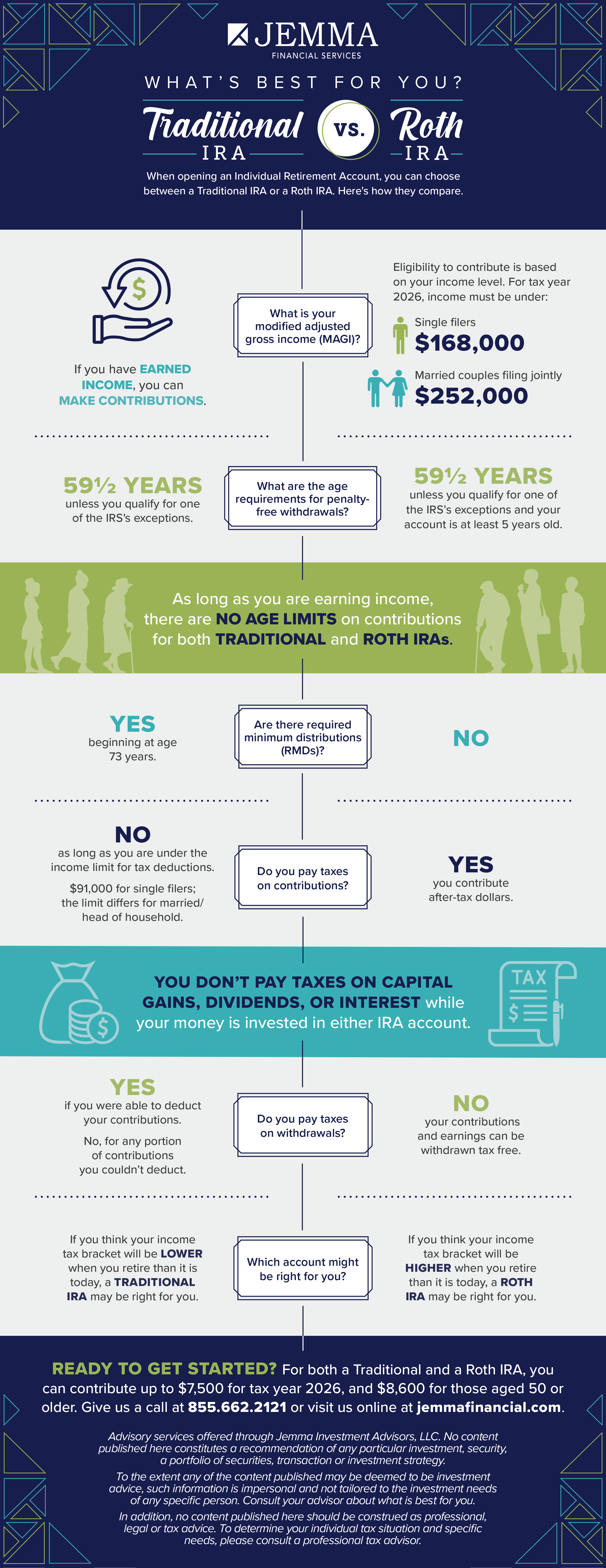 An Individual Retirement Account is an important part of your overall financial plan as it offers a way to save for retirement with tax-free growth or on a tax-deferred basis. When opening an IRA, you can choose between a Traditional IRA or a Roth IRA. The following infographic helps you decide what’s best for you.